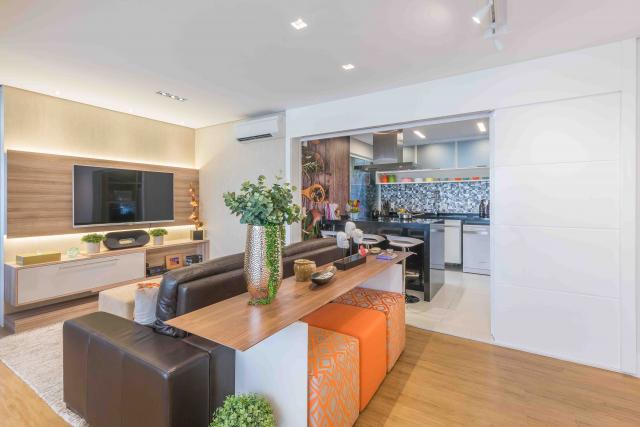 Nesse apartamento, living e jantar s?o integrados, e conectam-se com a ?rea externa atrav?s de uma porta de correr. A base clean e atemporal encontra-se nos revestimentos e tecidos ? como o espa?oso sof?, revestido com linho (A Especialista). Uma dupla de poltronas da mesma loja traz personalidade. A mesa de centro laqueada tem tampo de vidro e recebeu objetos decorativos da Lar Deco.