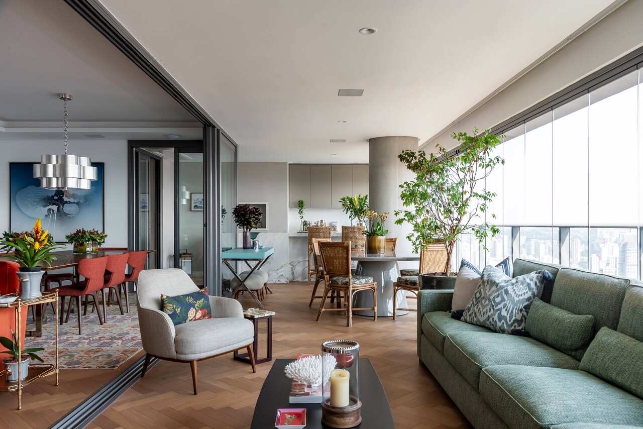 O terra?o amplo foi concebido como uma extens?o natural da ?rea social, projetado para momentos de lazer e contempla??o da vista deslumbrante. O piso de bambu contrasta harmoniosamente com o m?rmore natural, criando uma base neutra para o mobili?rio. ?Trouxemos um mobili?rio cl?ssico, incluindo pe?as do acervo da cliente e objetos que revelam hist?rias de viagem e de bons momentos da vida da fam?lia?.