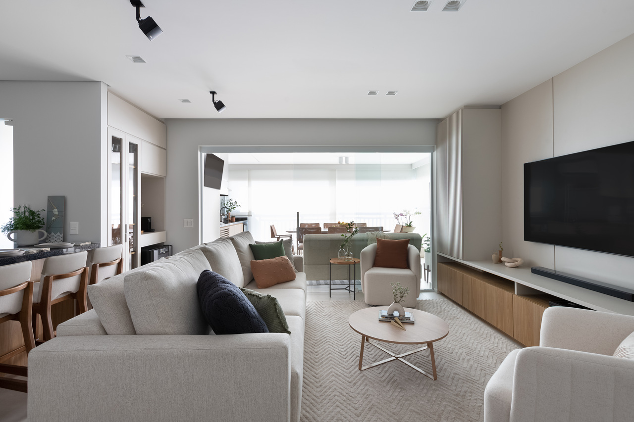 A sala de estar e a varanda gourmet foram projetadas para ampliar a sensa??o de espa?o, com um layout que facilita a circula??o. A mesa de jantar para oito lugares foi posicionada pr?xima ? churrasqueira, criando um ambiente ideal para refei??es e encontros sociais. O restante do espa?o foi dedicado ? ?rea de estar, que conta com um aparador e banquetas para refei??es r?pidas, formando um ambiente multifuncional e aconchegante.