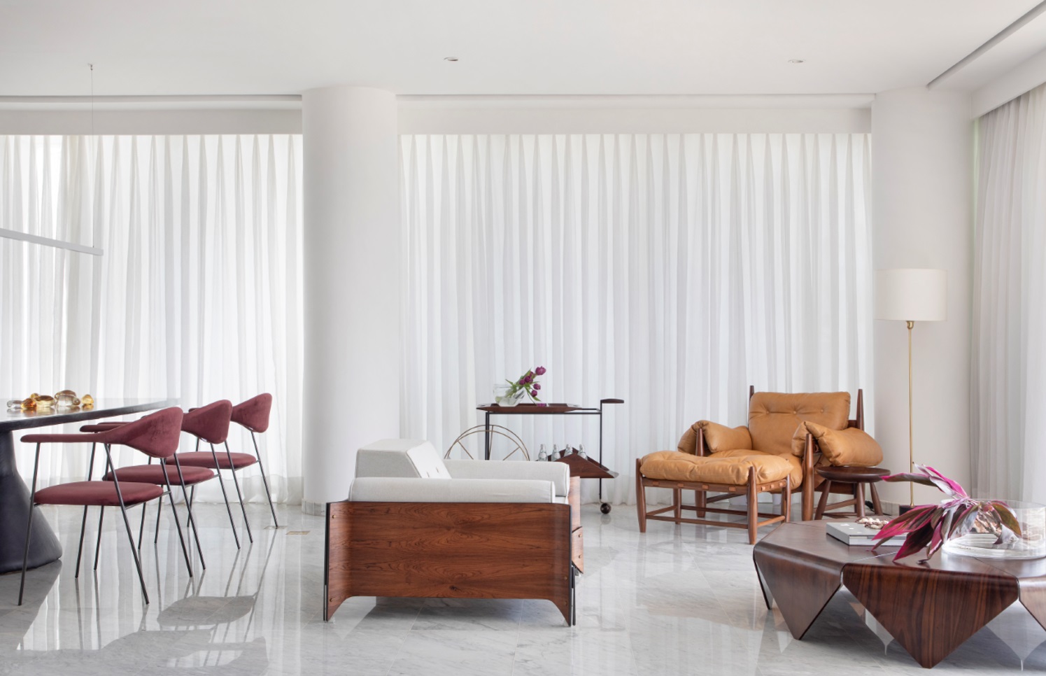 A madeira jacarand? domina o cen?rio, emprestando profundidade e peso hist?rico ao espa?o. M?veis vintage de designers consagrados como Jorge Zalszupin dialogam com os estofados em texturas e cores estrategicamente escolhidas, criando um equil?brio visual sofisticado.