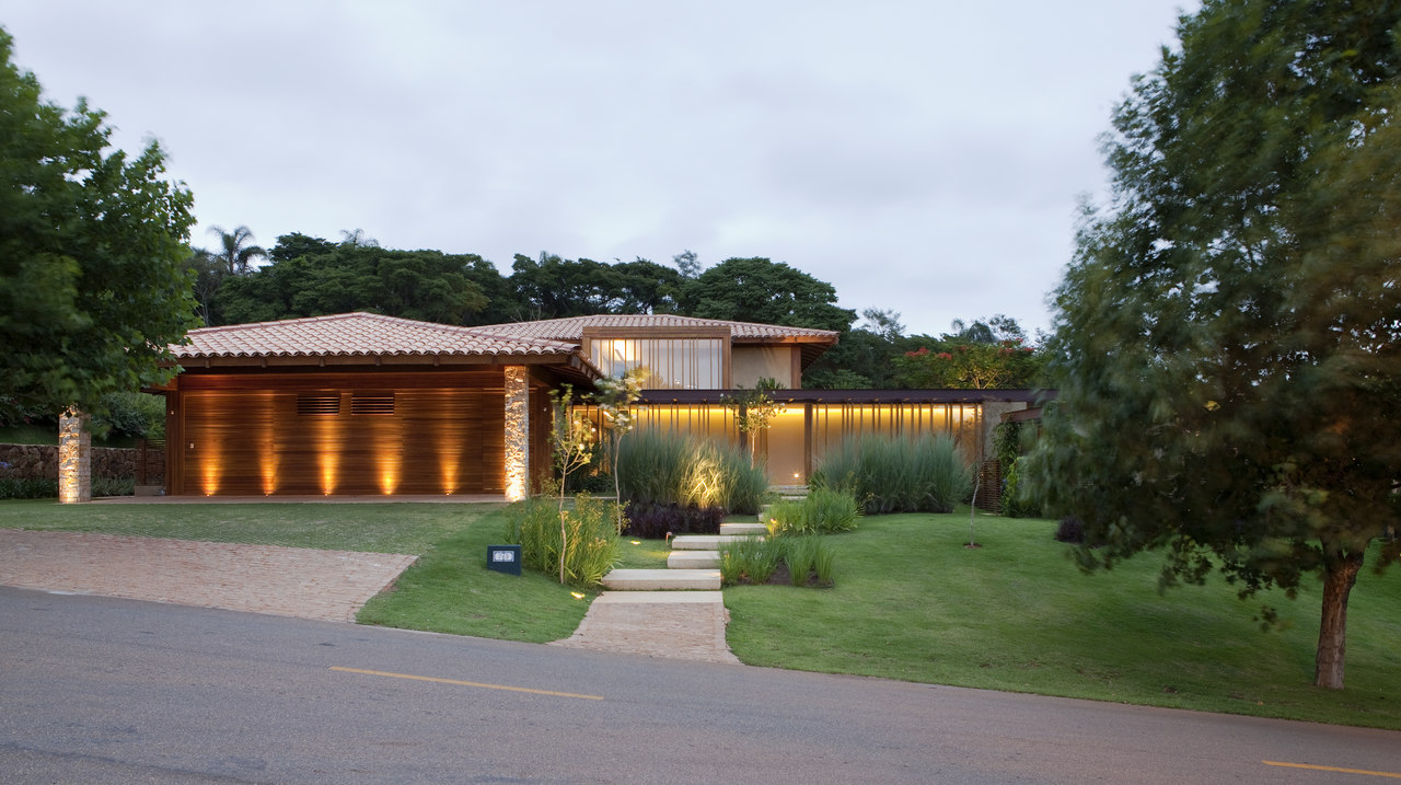 Predomina o uso de materiais que se integram com a natureza e com o clima de casa de campo, como a madeira nos caixilhos e revestimentos, a pedra natural na fachada, a telha de barro e muito vidro para dar transpar?ncia e conectar a casa com a ?rea externa.