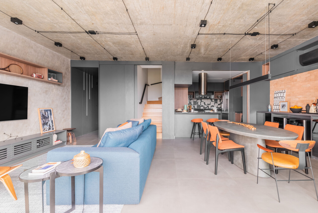 Com a predomin?ncia dos nuances de cinza, o arquiteto explica que os tons terrosos, comumente evidenciado nos tijolinhos, s?o sempre boas apostas para entregar um mix de cores dentro de uma proposta aconchegante. Nas possibilidades, ele tamb?m destaca que, quando bem dosado, cores vivas como verde, laranja, azul e as varia??es da cartela pastel resultam em composi??es super harmoniosas.
