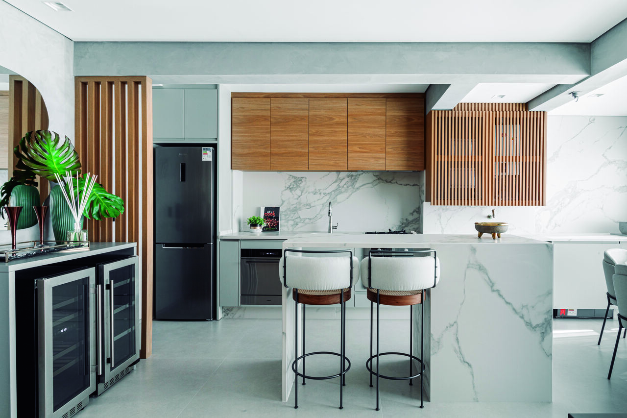 Claro, leve e equilibrado, assim ? o living deste apartamento no bairro Bela Vista, S?o Paulo, criado para um australiano que ama o Brasil pela designer de interiores Laudiana Trolezi, titular do escrit?rio Ekivale Design. Logo na entrada, a cozinha tem revestimento no padr?o Calacatta aplicado na parede e ilha para trazer sofistica??o com seus veios acinzentados, complementares ao concreto armado que se expande para a sala de jantar e tv. No mobili?rio contempor?neo, tons neutros e a madeira clara comp?em o d?cor, tudo em perfeita harmonia para trazer aconchego e o clima de paz na metr?pole.?