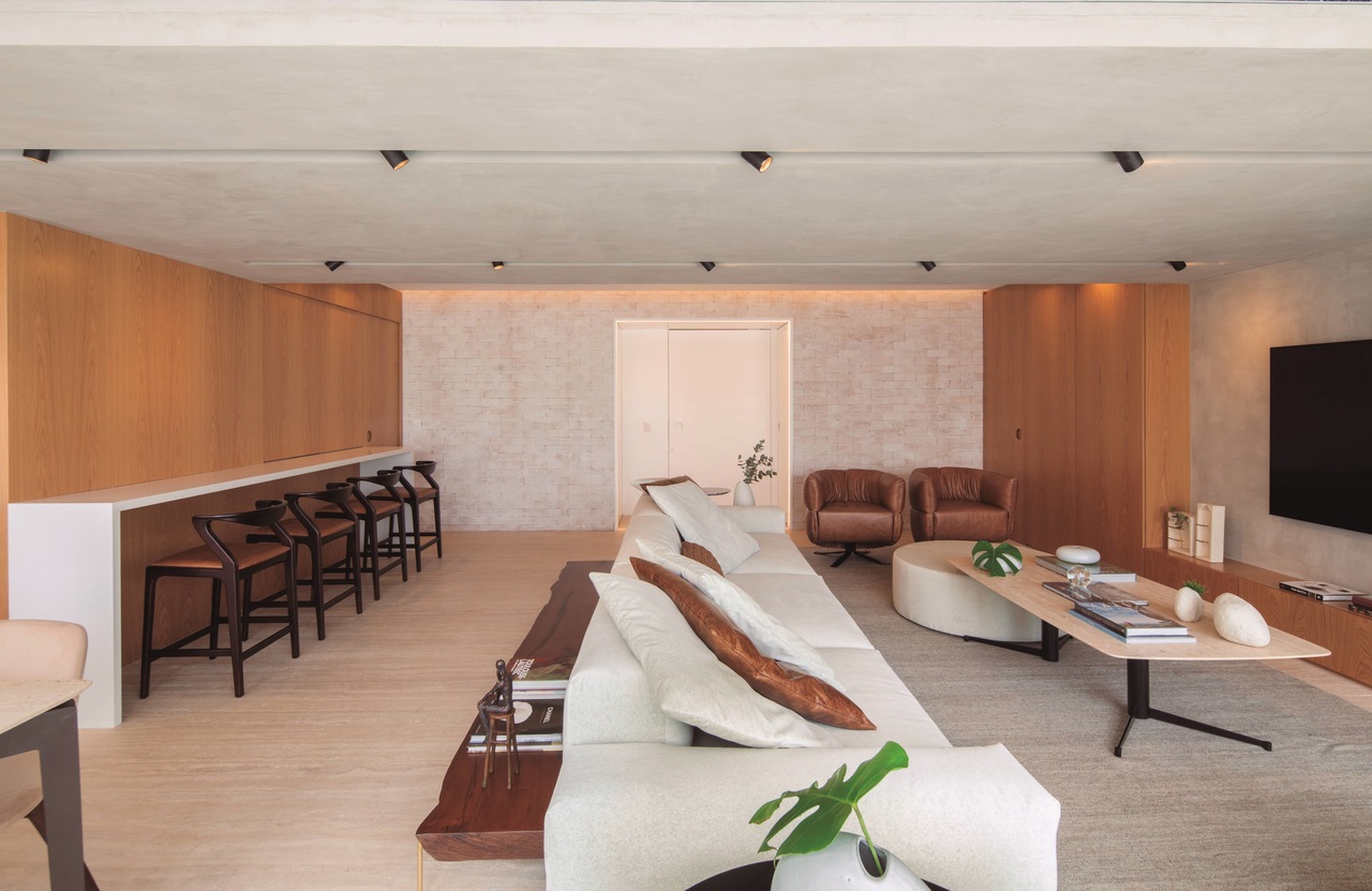 Localizado no bairro Brooklin, o apartamento de 160m? recebeu um projeto para atender a demanda dos propriet?rios, que queriam um maior aproveitamento entre os espa?os. Foi a partir da viga estrutural que atravessa a ?rea social e que originalmente dividia o living da varanda, que o projeto da sala foi executado e os demais espa?os tomaram forma. Com planos bem definidos, o layout criado pelo escrit?rio Conrado Ceravolo Arquitetos, tem direito a uma sala ampla, onde o p?rtico de cimento queimado emoldura todo o living, desde a churrasqueira at? a tv. O teto foi rebaixado para acolher a viga e, tamb?m, o ar-condicionado com grelha bilateral, que climatiza de forma uniforme todo o espa?o do living e jantar.?