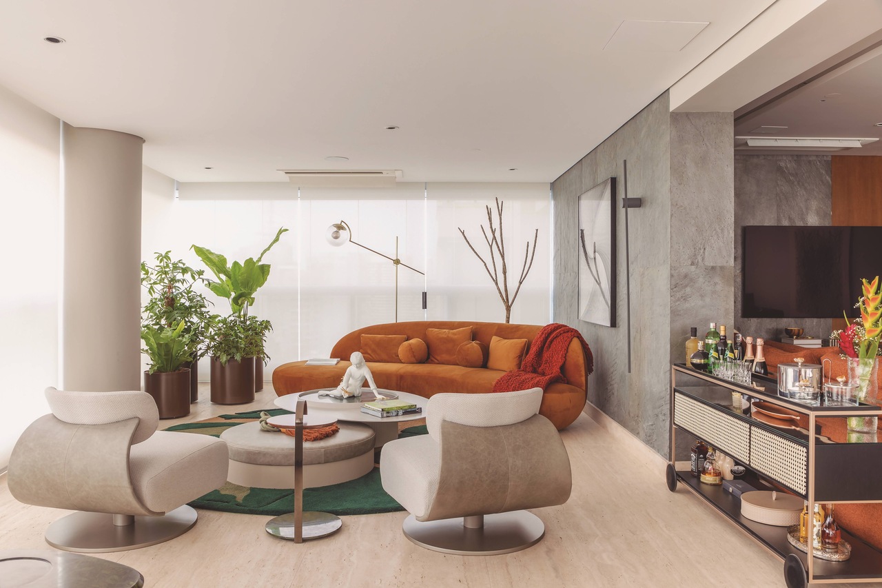 A base do projeto ? composta por texturas naturais, como pedras e madeiras, que trazem calor e autenticidade ao lar. Paredes em tons neutros foram utilizadas como uma tela s?til para destacar obras de arte e pe?as de design, com pontos focais que remetem a personalidade dos clientes. Um dos pontos altos do projeto ? a varanda. O sof? curvo em tom p?prica, posicionado sobre o tapete redondo que retrata a floresta amaz?nica, confere uma sensa??o ?nica. Embora conectado aos outros ambientes sociais, este espa?o ? ideal para conversas, leitura e receber convidados.