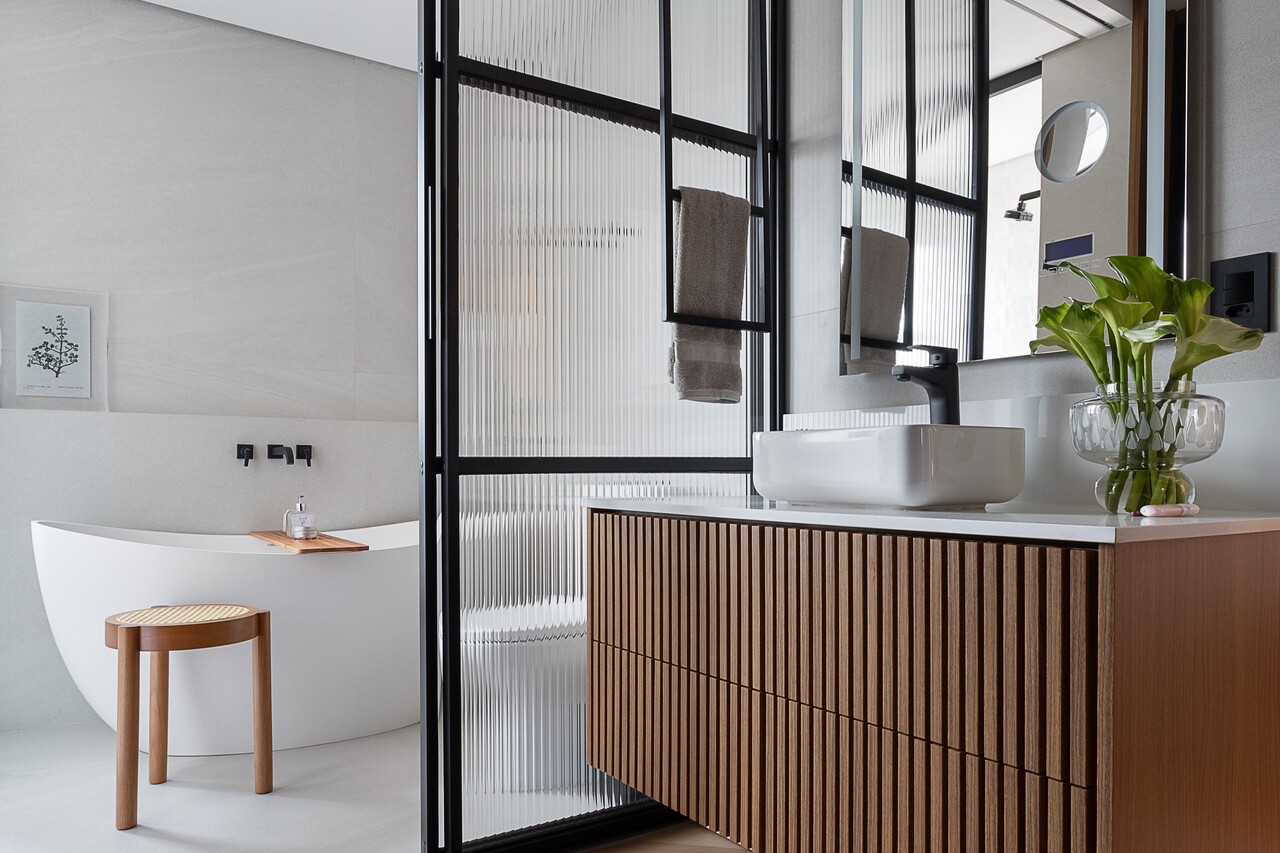 Nos revestimentos, a arquiteta utilizou o porcelanato Ms. Barcelona da Portobello Shop Santo Andr? em toda a ?rea social, cozinha, ?rea de servi?o e banheiros, al?m do Gouache Nouage, usado no box do banheiro da su?te master. Sobre a Portobello, Gislaine destaca: ?Temos uma parceria de longa data, sempre especifico os produtos da marca em meus projetos por terem uma leitura moderna e atual?.