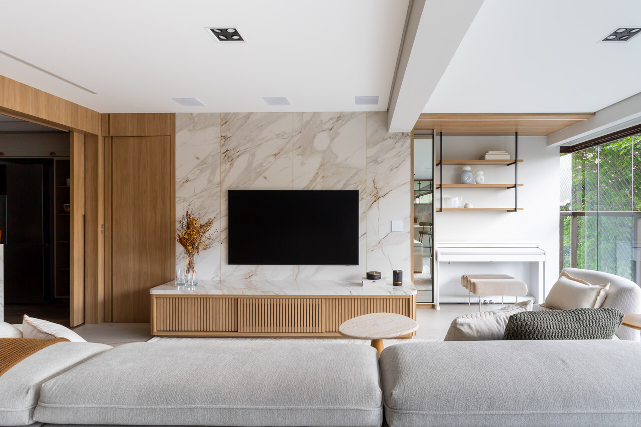 Na reforma, ela conta que promoveu o nivelamento do piso da ?rea social que abarcou uma ilha para a ?rea gourmet com churrasqueira a g?s. A percep??o refinada do efeito marmorizado torna-se evidente no painel da TV e na base superior do rack de madeira. Todos esses elementos citados pela arquiteta ganham um novo contorno quando s?o iluminados pela abundante luz natural que adentra atrav?s do generoso fechamento de vidro que premia o apartamento com a vista para o verde das copas da ?rvore existentes na rua, uma vez que n?o est? em um andar muito elevado.