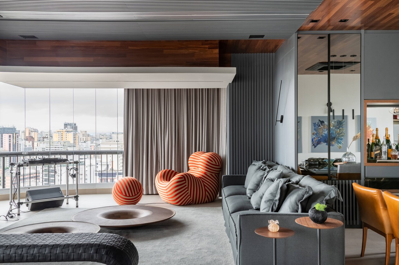 Projeto de interiores para apartamento em Higien?polis ganha ambientes integrados com pe?as de design e vista para o skyline de S?o Paulo.