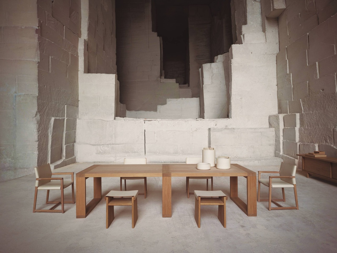 Para sala, Van Duysen criou sof?, poltronas, mesa de centro e arm?rio. A mesa lateral pode ser utilizada tamb?m como mesa de jantar, isso mostra a versatilidade dos produtos e suas poss?veis utiliza??es em diferentes ambientes.