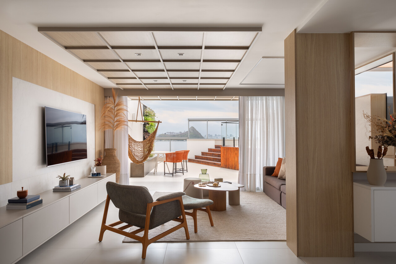 A vista privilegiada para a praia de Charitas ? uma das mais bonitas de Niter?i ? inspirou a escolha de materiais que remetem a padr?es naturais, como pedras, cimento e decora??o em cestarias e fibras. As colunas estruturais que n?o puderam ser removidas, foram revestidas com folhas de MDF no tom carvalho claro, passando a integrar o projeto como um elemento de marcenaria, assim como os quadrantes do teto que refor?am o protagonismo da madeira e destacam a ?rea social at? o terra?o.